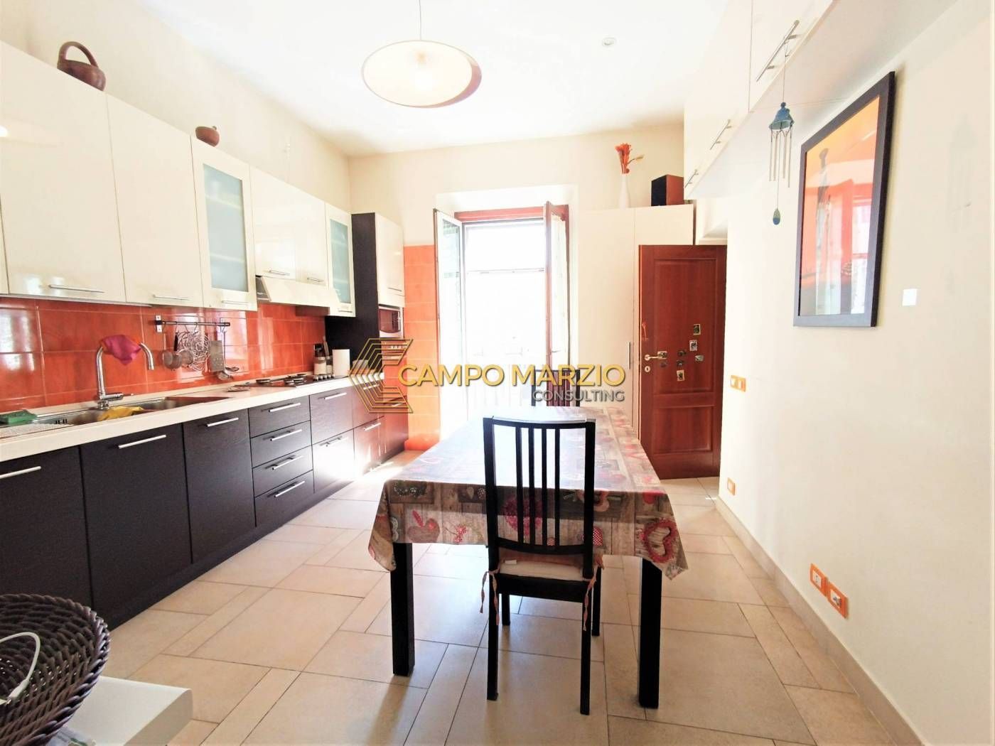 L'accesso è diretto sull'arioso soggiorno con angolo cottura e balcone con affaccio nel verde.